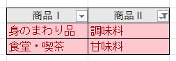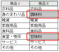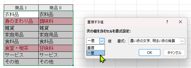 これで、重複していない(片方にしかない)データが色付きで強調されます。