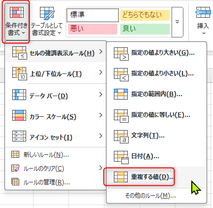 ②「セルの強調表示ルール」から「重複する値」を選択します。