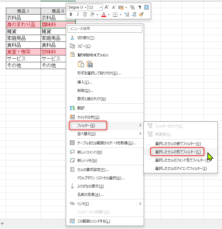 さらに便利に使うテクニック: 強調表示されたセルを右クリックし、フィルターメニューから「セルの色でフィルター」を選択してみてください。こうすることで、重複していないデータだけを抽出してリストアップすることができ、素早い比較が可能になります。