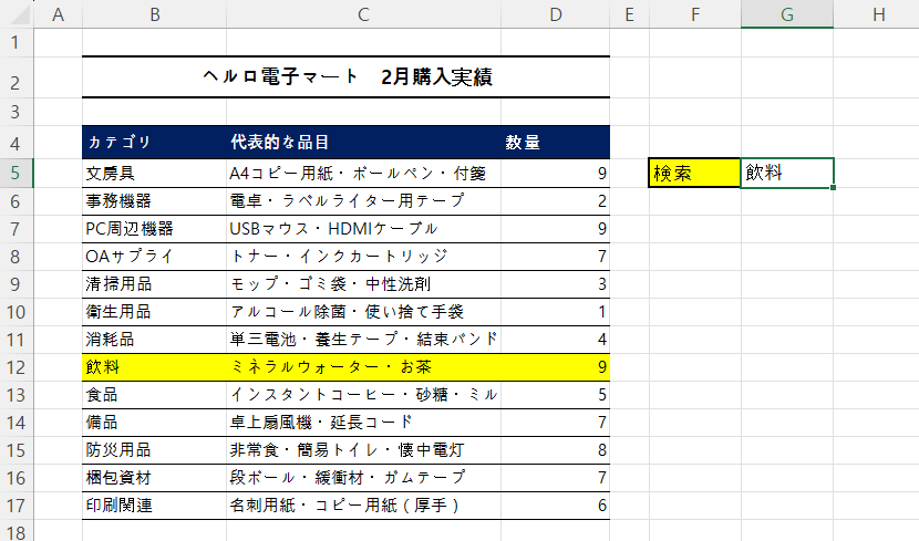 $G$5セルに”飲料”を検索すると、以下の通りになります。